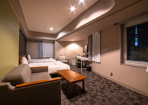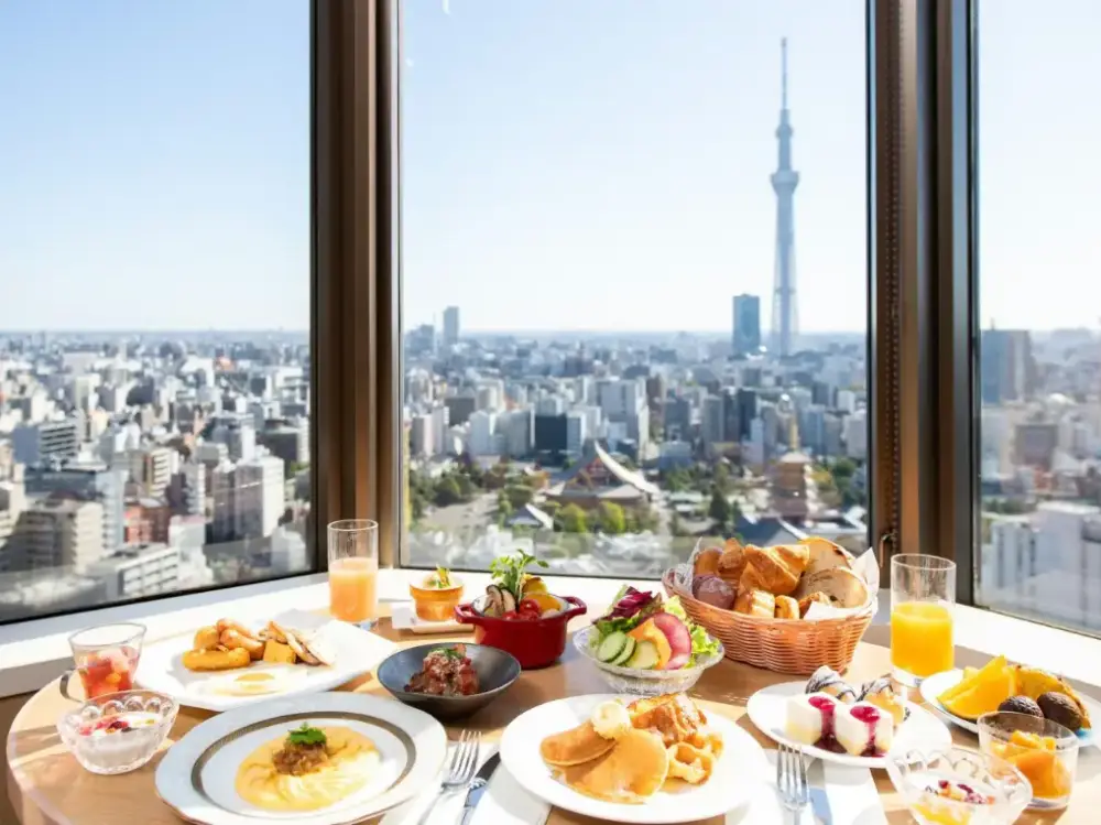 浅草随一の高層シティホテルで、東京スカイツリーを正面に望む絶景が魅力です。つくばエクスプレス浅草駅直結で雨の日も安心、未就学児は添い寝無料でベビーベッドやベッドガードなどの貸出備品も充実しています。26階のスカイグリルブッフェでは約80種類の料理を楽しめ、子ども用の食器や椅子も完備。浅草寺まで徒歩圏内で観光にも便利な立地です。