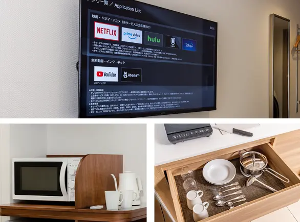 | 特徴・おすすめポイント | ・全室洗濯乾燥機・電子レンジ完備 ・駅直結で子連れに便利 ・ReFa製品導入 ・客室で温めて食べる朝食スタイル ・長期滞在に最適 |