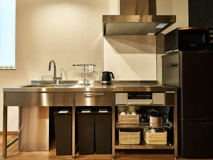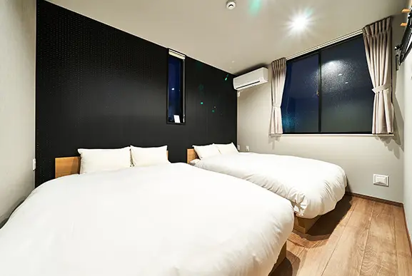 2LDKの一棟貸切タイプで、最大7名まで宿泊可能な貸別荘スタイルの宿泊施設です。ダブルベッド2台と布団3組を完備し、キッチン(冷蔵庫・電子レンジ・コンロ付)や洗濯乾燥機、洗い場付きバスルームなど、まるで自宅のように過ごせる設備が整っています。長期滞在にも対応できるゆとりの設計で、ファミリーや三世代旅行に最適です。無人運営によるスマートチェックインで、プライベート空間を重視する家族連れにぴったり。周辺にはアウトレットや観光施設も充実しています。