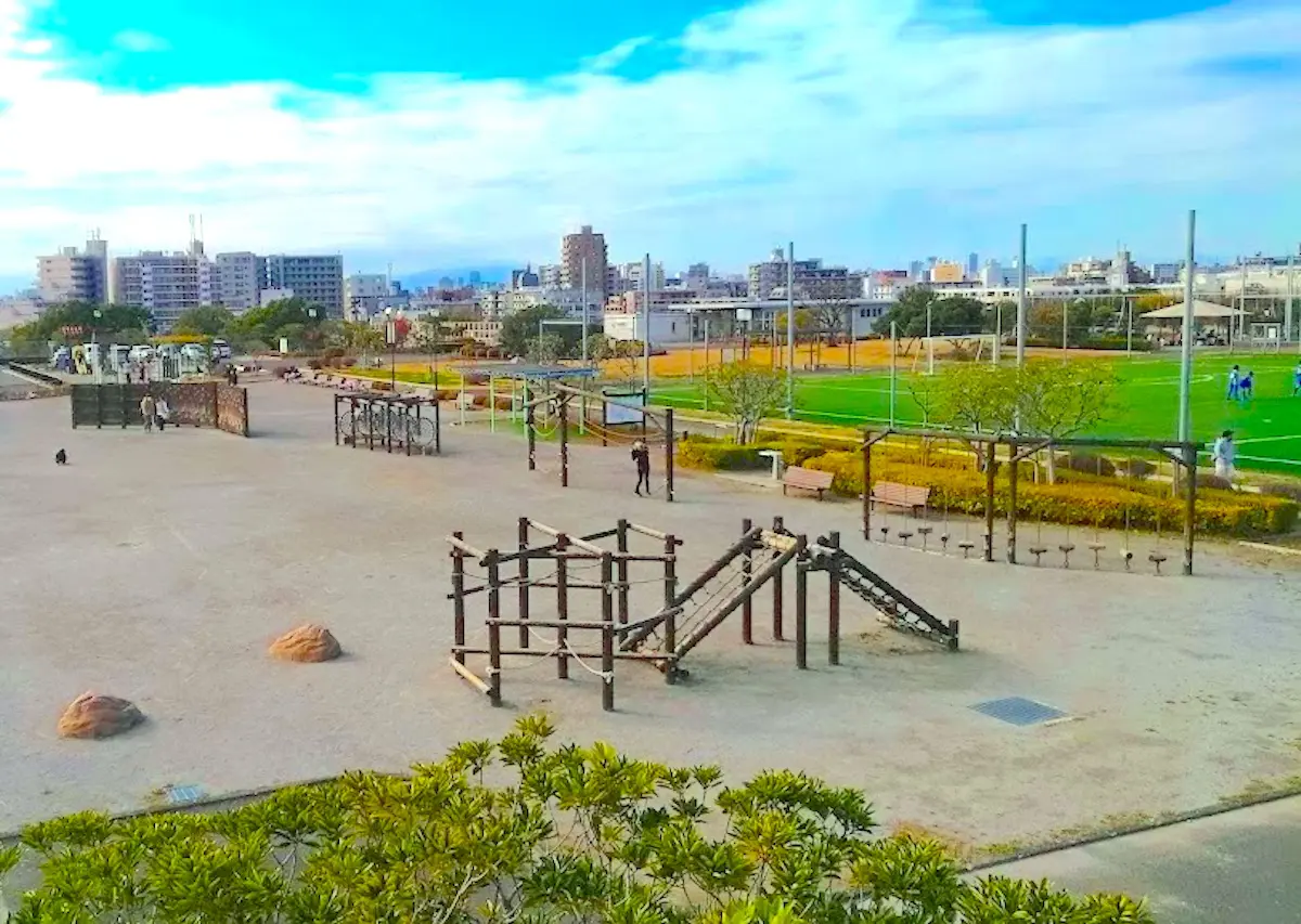 森ヶ崎水再生センターの屋上に整備された公園で、羽田空港が一望できる展望台があります。木製アスレチック遊具や砂場、バスケットゴール、キャッチボール場など、多彩な遊び場が揃っています。サッカー場やフットサル場、テニスコートなどの有料スポーツ施設も併設されています。芝生広場では小さい子向けの滑り台やフルーツのモニュメントがあり、1歳児でも楽しめます。飛行機の離着陸が間近で見られるため、飛行機好きの子供たちに大人気です。駐車場は47台と限られているため、土日祝日は公共交通機関の利用がおすすめです。園内は広々としており、のびのびと遊べます。