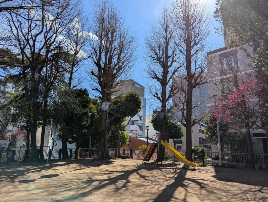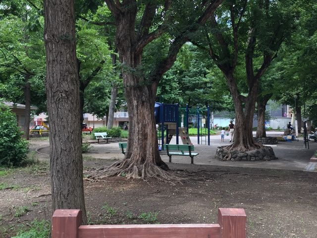 JR大森駅西口から徒歩約1分、天祖神社の境内にある小さな公園です。遊具はすべり台と鉄棒のみで、木々が生い茂った木陰にベンチがあります。神社の境内にあるため、急な階段を登る必要があります。規模が小さく遊具も限られているため、本格的な遊び場というよりは、駅近の休憩スポットや散歩の立ち寄り先として利用されています。駅から最も近い公園として、ちょっとした休憩や短時間の遊びには便利な場所です。静かな環境で、神社の雰囲気も楽しめます。