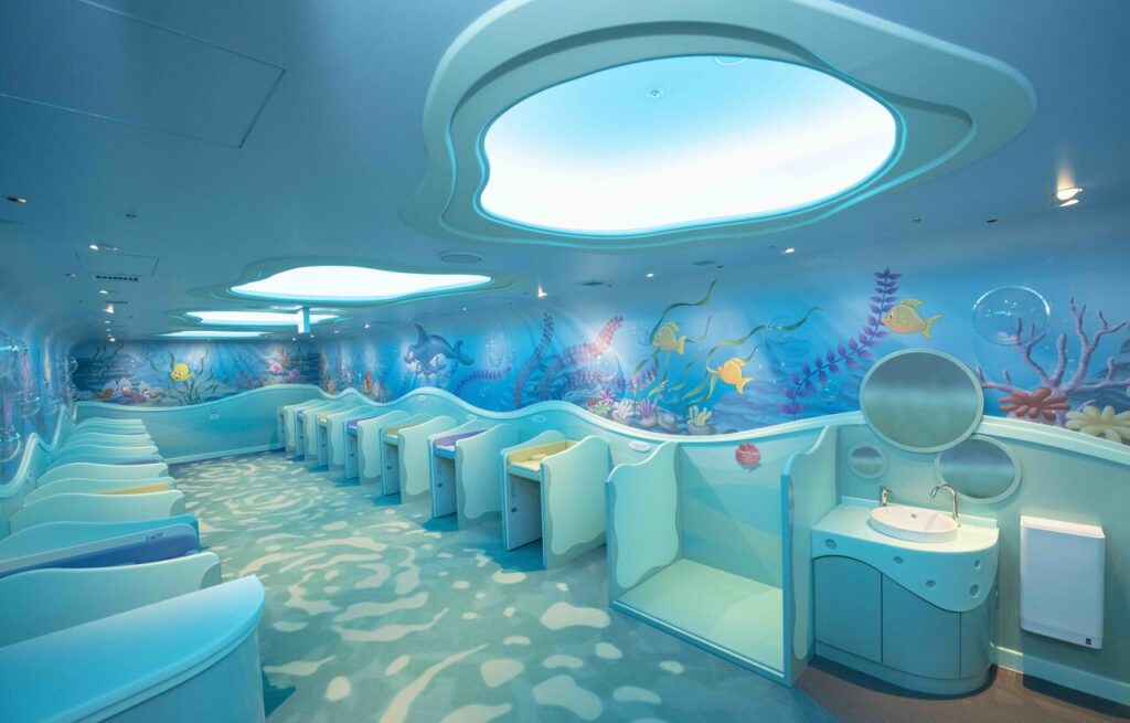 授乳室・おむつ替え有り(ベビーセンター1か所:マーメイドラグーン内)/ 清潔で個室完備、キャスト常駐、おむつ・粉ミルク販売あり、おむつ交換台は園内全トイレ(男女とも)に設置