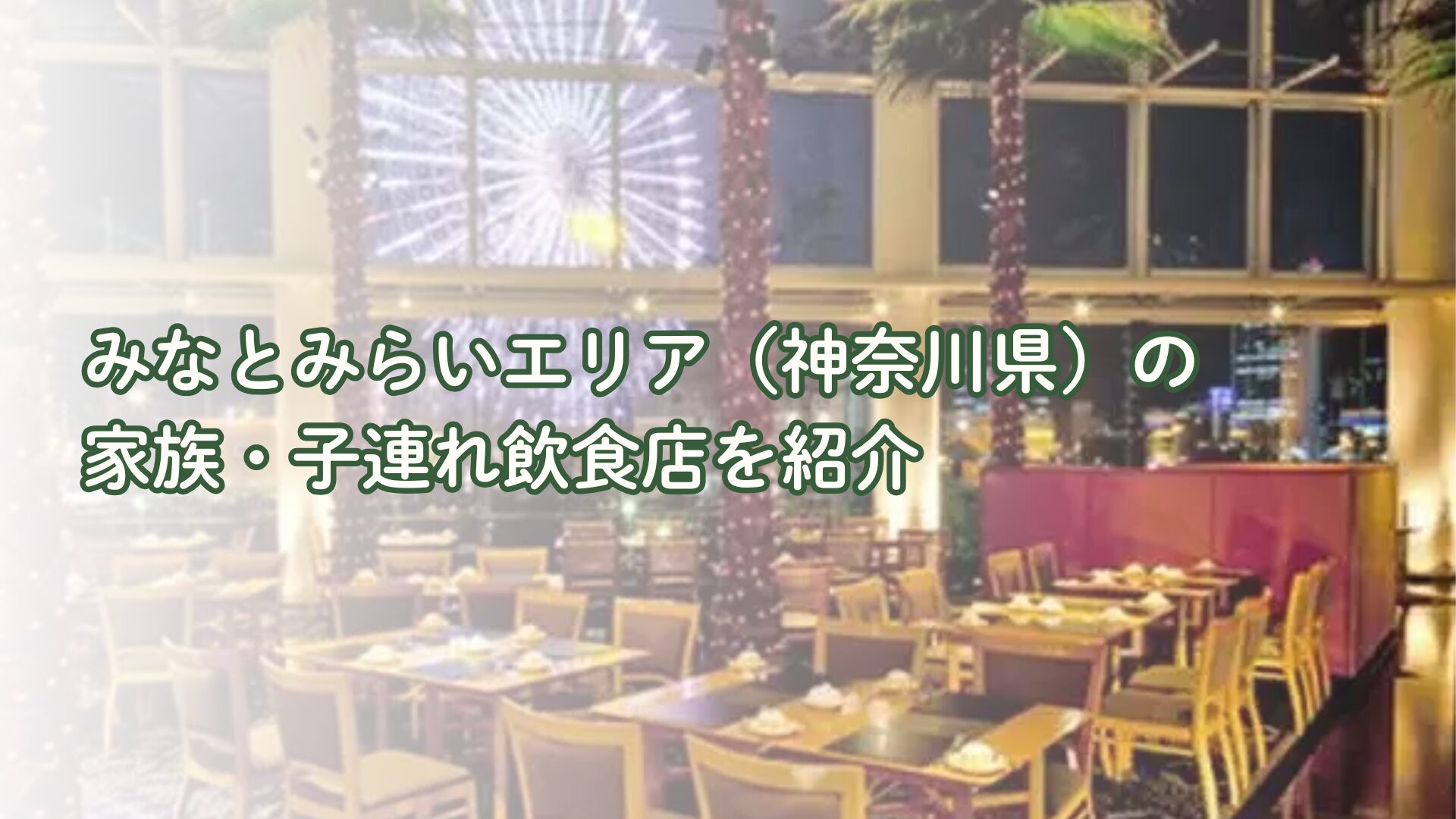 みなとみらいエリアは、横浜を代表する観光・商業エリアです。みなとみらい線「みなとみらい駅」を中心に、MARK IS みなとみらい、クイーンズスクエア横浜などの大型商業施設が集まり、各施設内に授乳室やおむつ替えスペースが完備されています。駅直結の施設が多くベビーカーでの移動も快適で、雨の日でも安心です。子連れウェルカムな飲食店が充実しており、キッズメニューや個室・座敷席を備えた店舗も豊富です。
