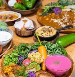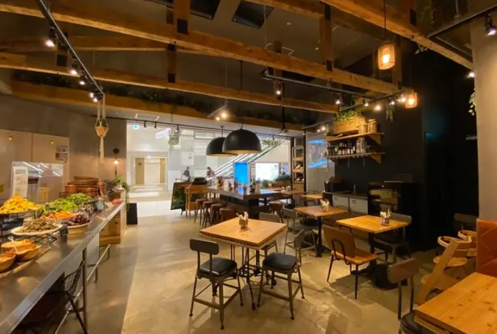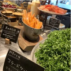 自社農場から直送される新鮮な野菜をビュッフェスタイルで楽しめるレストランです。ランチは野菜ビュッフェが人気で、ディナーではコース料理も充実。小学生未満のお子様はビュッフェが無料という嬉しいサービスがあり、家族連れに大人気。珍しい野菜や日替わりメニューで、訪れるたびに新しい味に出会えます。広々とした店内はオシャレな農場小屋をイメージした空間です。